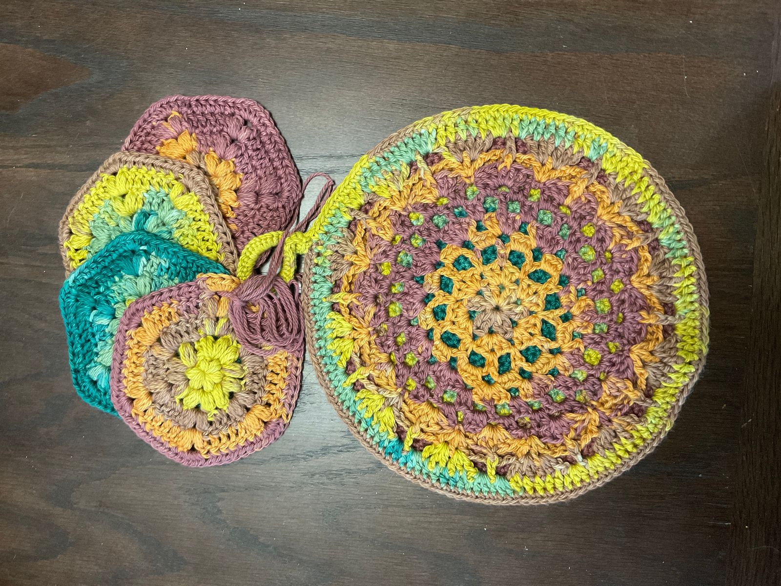 I use this yarn to make hotpads/ovenmits/coasters and the colors work up awesomely in the round! Based on the pattern I am using, I can get a single hotpad and 4 coasters out of one skein. These will be gifts for family and friends and are so easy to make! The attached pic is the colorway “Fall Vibes”.