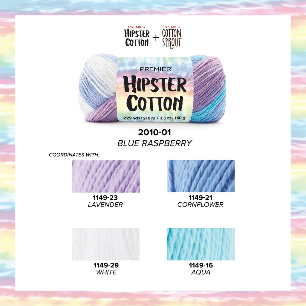 This DK weight, 100% cotton yarn features bright and bold stripes, reminiscent of tie-dye. Hipster Cotton for creating fun and colorful garments and accessories for all ages. Use it for standalone summer garments or winter layering pieces, either way, it will some lively color to your wardrobe!