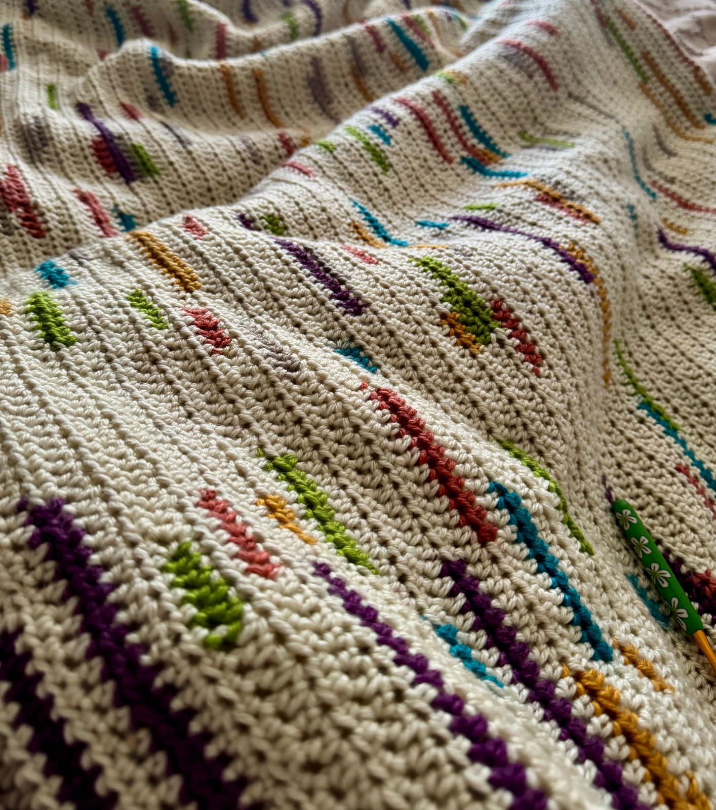 I cleaned this blanket for my daughter and this young could be more of a pleasure to work with. It is absolutely gorgeous. I used the color Boho with a 6 mm crochet hook and a half double crochet stitch and I’m so happy with the results. I just ordered Sunday brunch to make a baby blanket!