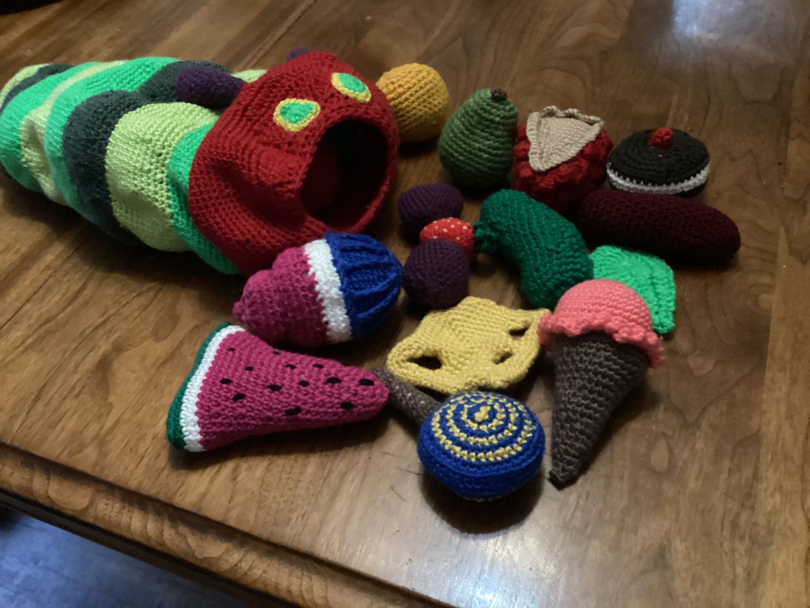 This pack of little yarn skeins was just what I needed to crochet my Very Hungry Caterpillar. I found just about every color I required, and in the right amounts, without having to buy whole large skeins. It was like opening a new box of color crayons, selecting the shades to match my pattern’s guidelines. The price broke down to $1 per skein, and if I needed more, the same colors are available in full sized skeins. Just what I needed!