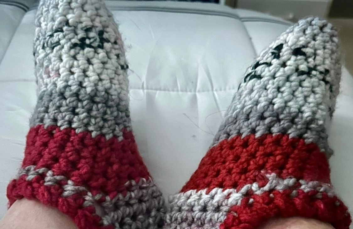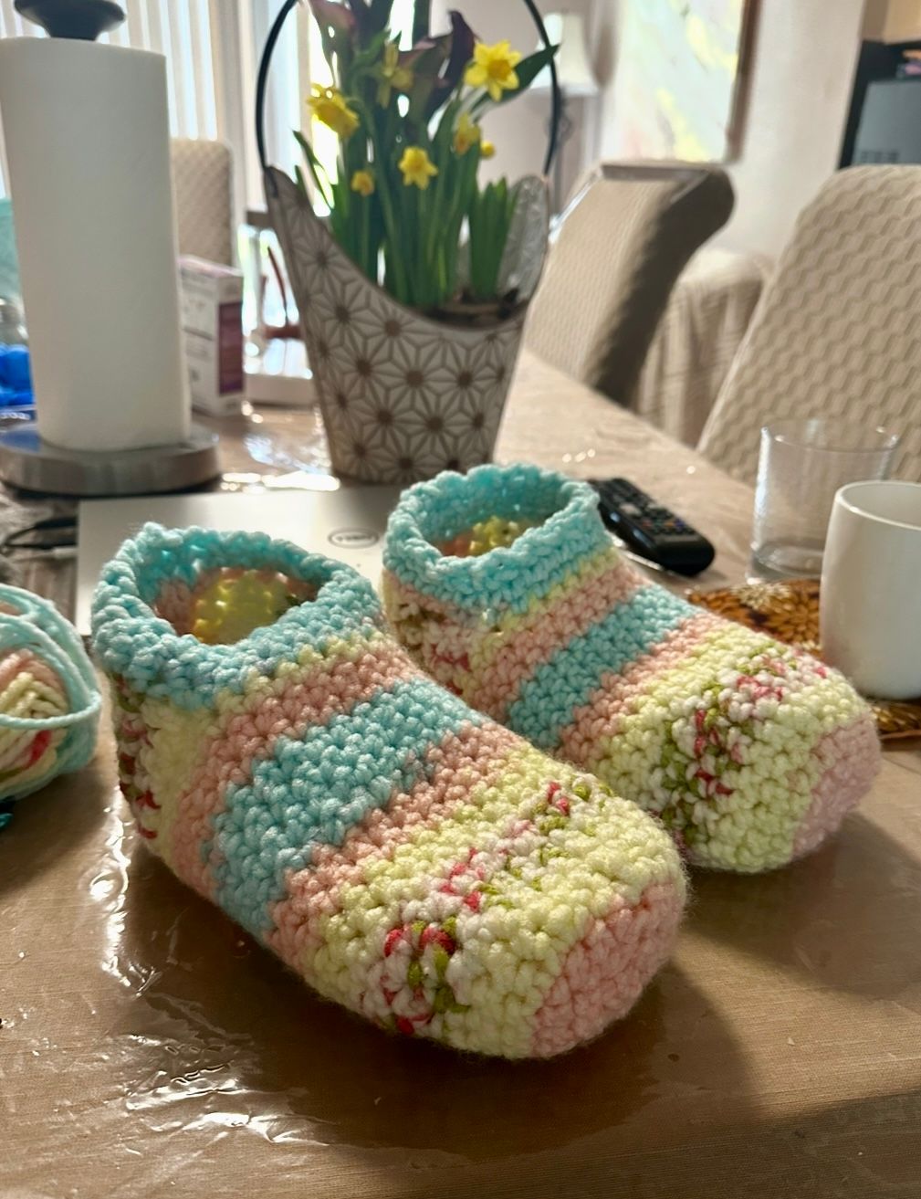This yarn makes the most beautiful and comfortable slippers. I have made slippers in all colors and wish I could buy these colors again. I am wearing a pair in the Tulip but did not take a picture. We all love them, especially the with blooms in the yarn.