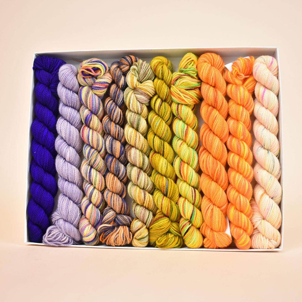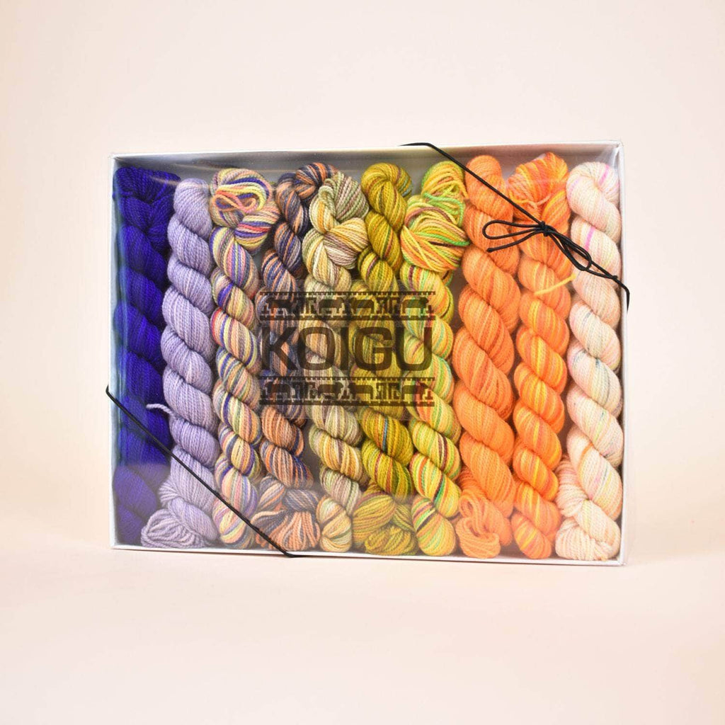 Koigu Pencil Box features 10 different colors in 25g skeins, specially curated by the women at Koigu. There are many ways that one can utilize the 250g, whether that be as a project, trim, to add little bits of extra colour or further variation of colour. Each mini skein is hand-dyed Koigu Painter's Palette Premium Merino (KPPPM) fingering weight 100% merino yarn. Koigu's Merino wool is an ultrafine fiber, silky smooth and tightly plied for durability.