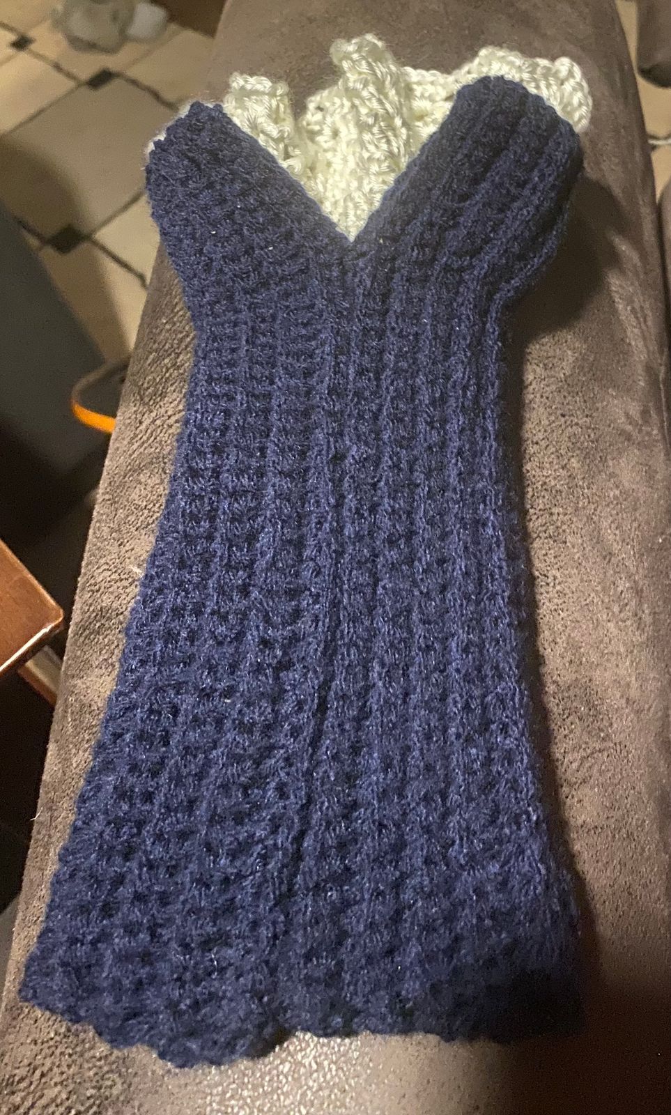 This yarn is so pretty and makes up just lovely! I didn’t get a picture of the finished piece because the pattern ended up smaller than stated. But attached is when I started it. Sleeved shawl. And I wasn’t going to take it apart! So gifted it to a friend. Also made fingerless gloves for another friend. Glove is pictured.