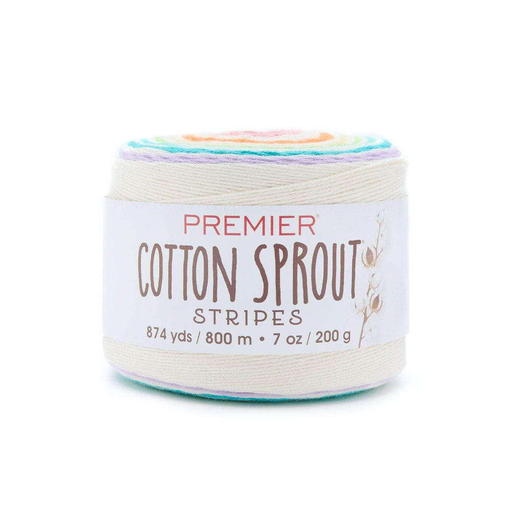 Cotton Sprout® Stripes joins the collection and brings bright blocks of color for bold projects. Sport weight 100% cotton just begs to become a warm-weather WIP, while generous yardage per cake means a little goes a long way. Self-striping in six colorways, each color change is fastened together for clean, even stripes throughout. Cotton Sprout® Stripes is great for breathable, easy-to-clean garments, accessories, and more!