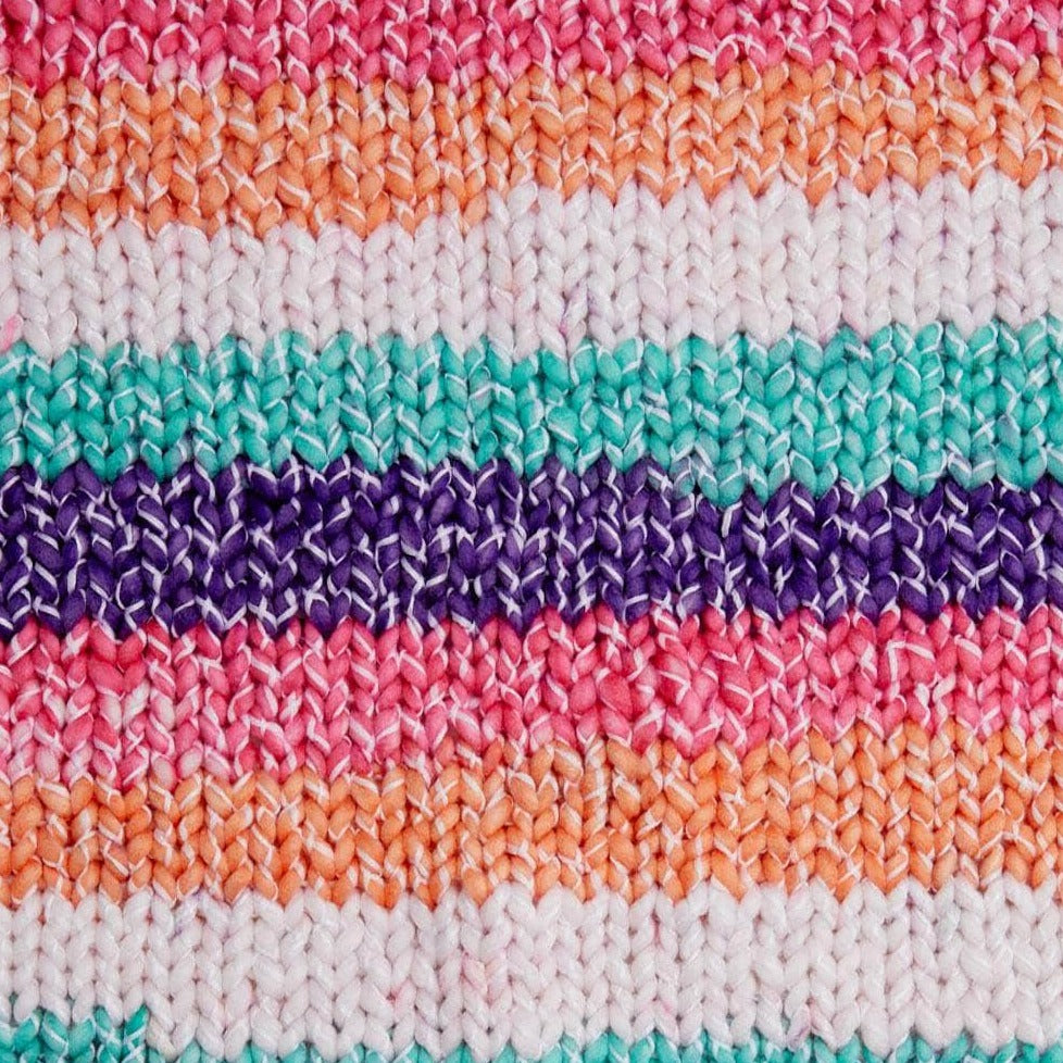 This is a #6, Super Bulky yarn with a blend of acrylic and polyester boasting unmatched softness with a single-ply construction wrapped with a unique crisscross effect. Not just pretty, it’s practical. Make a mistake, no worries. The crisscross binder holds in those loose strands making it easier to restart your project.