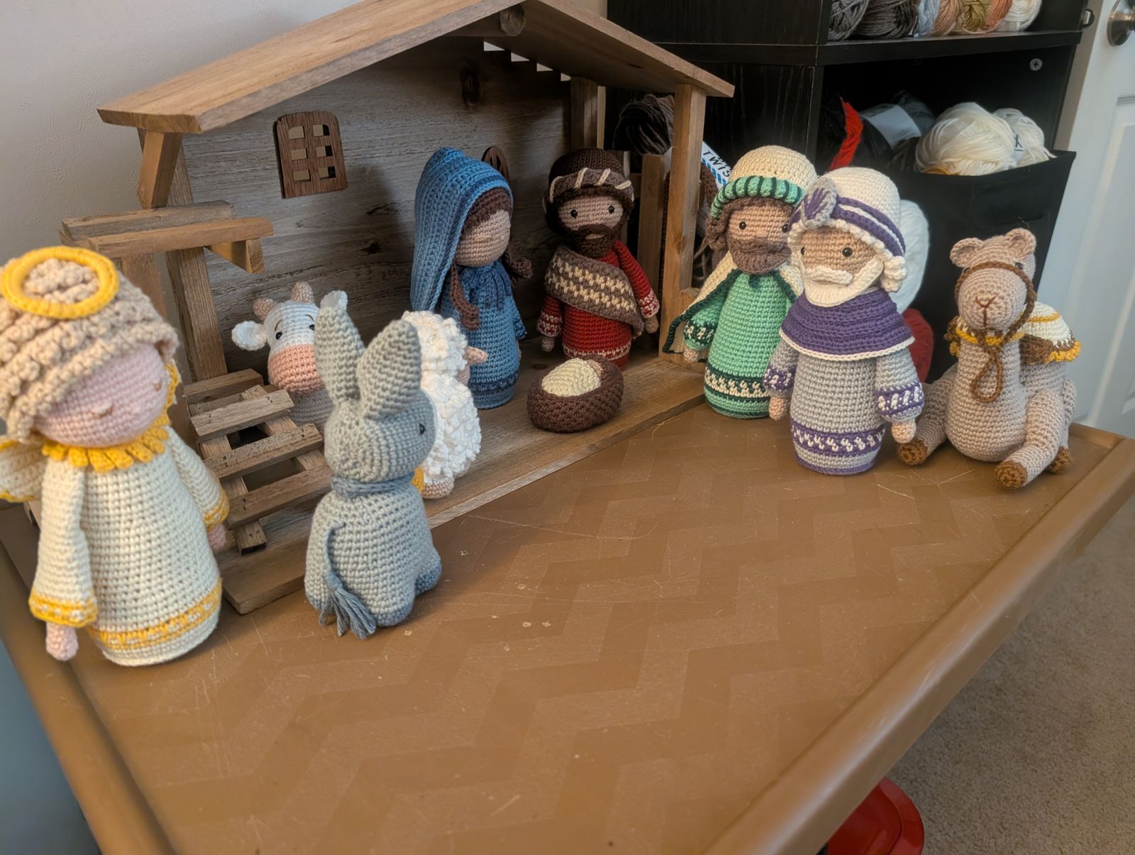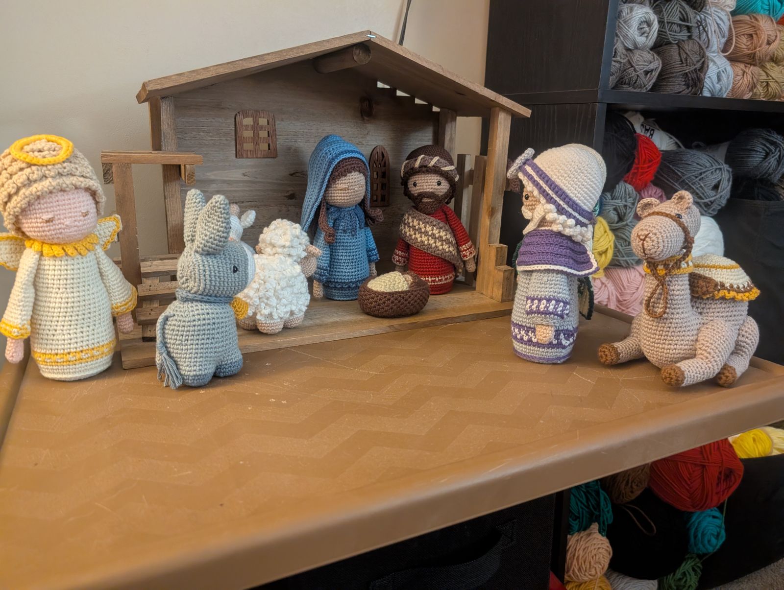 My sister and I found a wonderful Nativity crochet project (pattern by RNata) that includes Mary, Joseph, baby Jesus, an angel, three kings and multiple animals, including a camel! The Premier Minikins yarn was the perfect yarn for the project! The color selection combined with a few of the Premier Country Fair colors have been delightful for creating a beautiful keepsake. The projects are not quite finished but the results might just inspire us to do another whole set of figures in more of the wonderful colors.