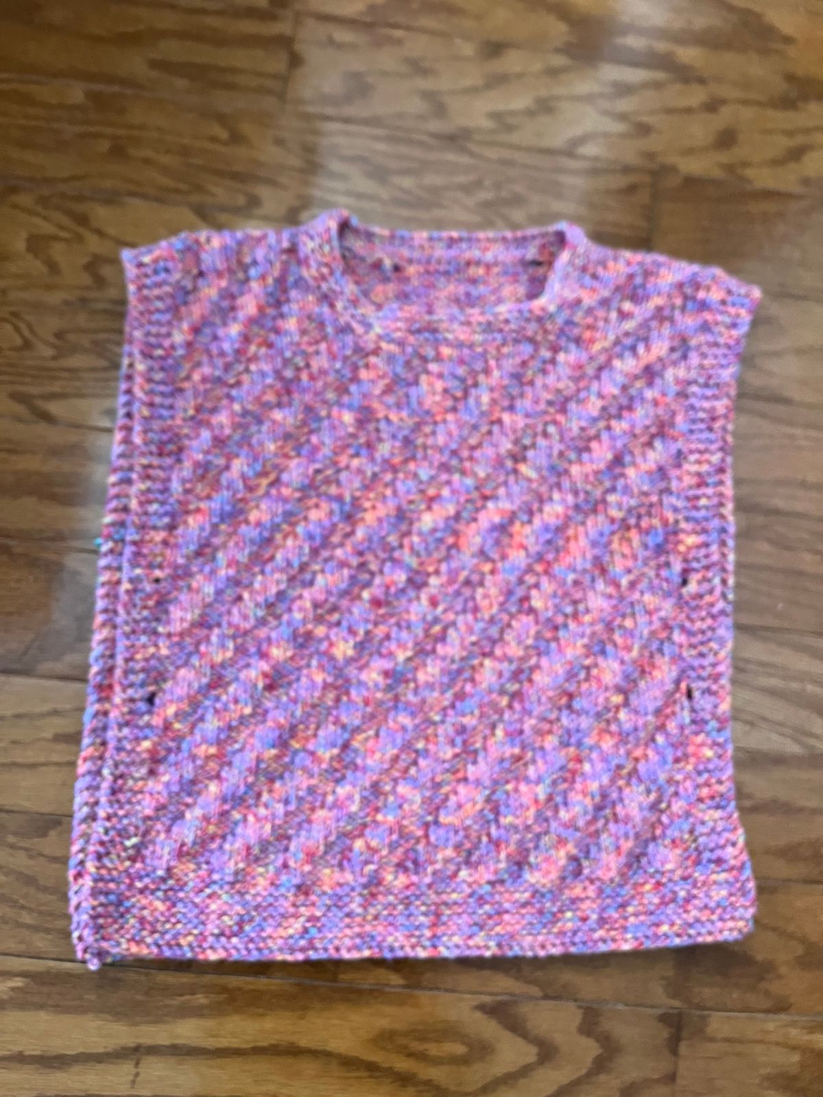 I selected this yarn to knit my middle great granddaughter a tabard sweater for Christmas. Her favorite color is usually pink but when I asked what color she wanted me to use, she surprisedly answered Rainbow. And, what do you know, there actually was a yarn by that name. I gave her the choice of the Rainbow yarn or several pinks. She wanted the Rainbow. It was a delight to work with had generous yardage, and didn’t split. We just selected buttons for the sides. She’s going to love the sweater.