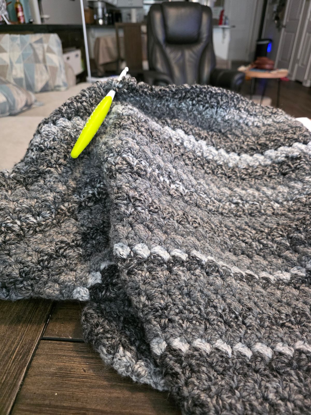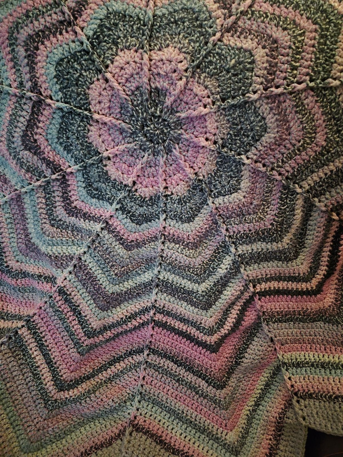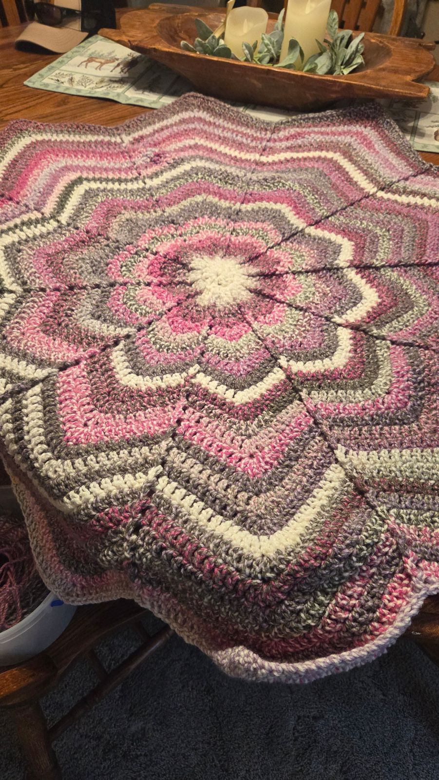 Anywho… yarn review! It’s ever so slightly scratchy but not deterring at all. It doesn’t split and the color palettes to choose from are beautiful. I will definitely be buying more for my stash, solids included. My favorite weight yarn for blankets. Not too thick, not too thin… just right :)