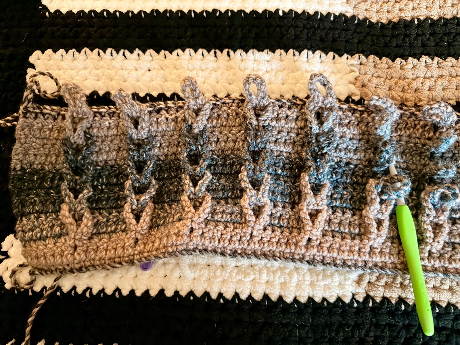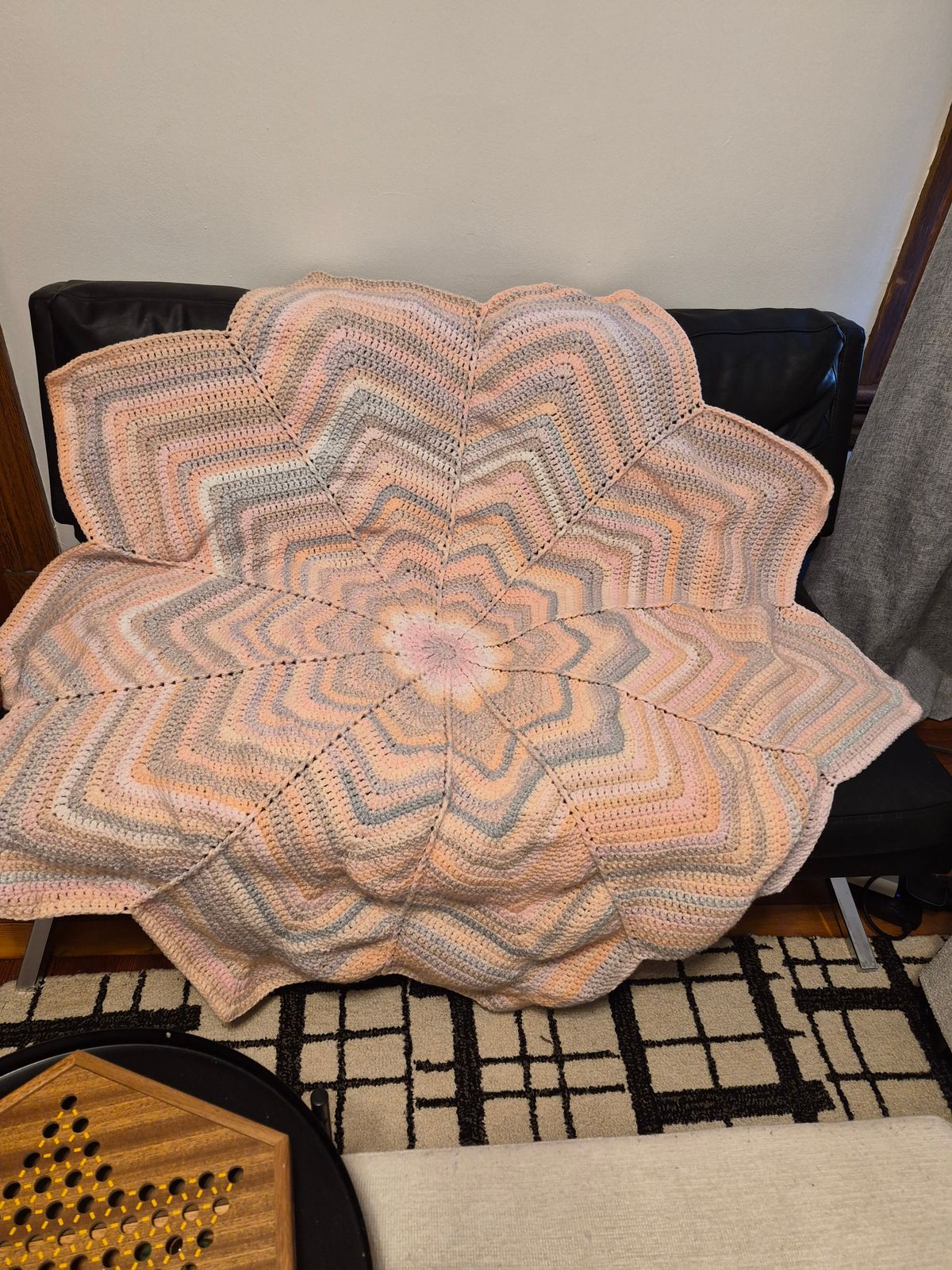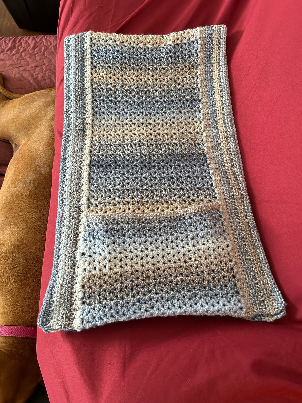 Anywho… yarn review! It’s ever so slightly scratchy but not deterring at all. It doesn’t split and the color palettes to choose from are beautiful. I will definitely be buying more for my stash, solids included. My favorite weight yarn for blankets. Not too thick, not too thin… just right :)