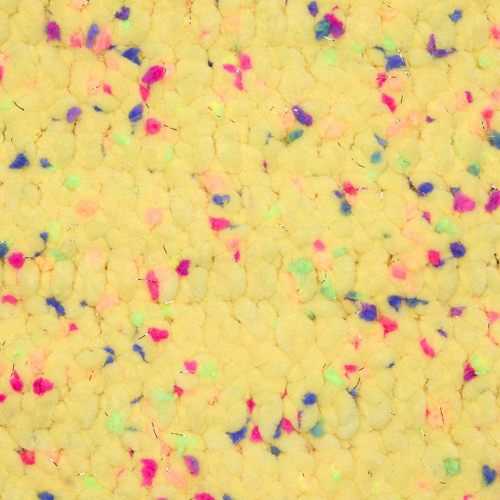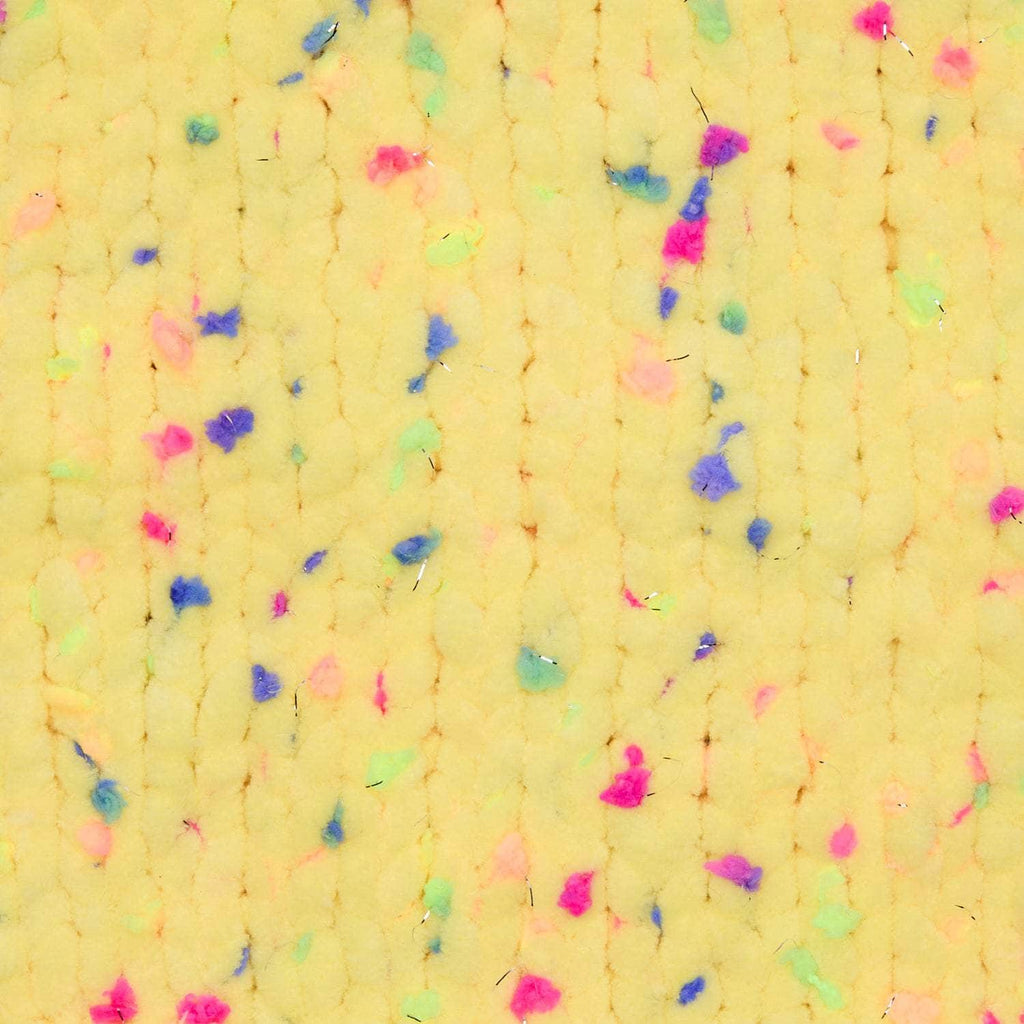 Our jumbo weight chenille yarn now comes with some big flair! Our tried and true, washable and dryable chenille yarn features colorful neon pom poms and glitter threads throughout, adding pops of color and sparkle to any project.