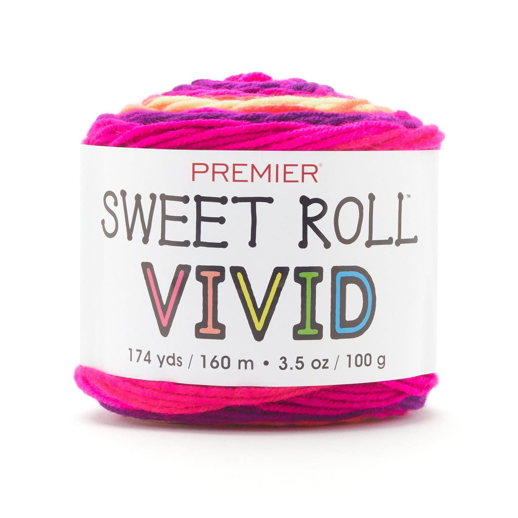 A bright and vibrant addition to the much-loved Sweet Roll® family! Sweet Roll® Vivid is an exciting, soft, and gorgeous yarn that creates a self-striping effect as you stitch. These beautiful new shades are full of color and WOW appeal. They are guaranteed to brighten up any project your are making. Perfect for creating stand-out scarves, shawls, blankets, and any other project you can imagine. Pair with Premier Basix® Worsted for coordinating solid colors.